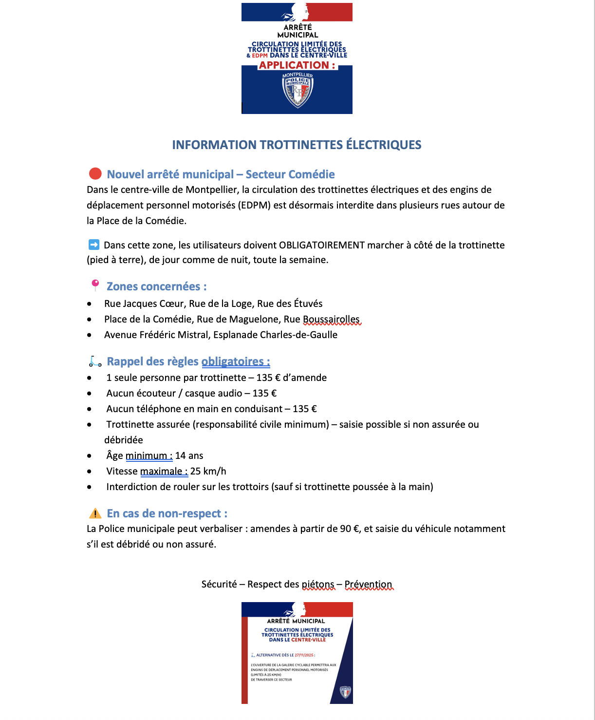 Dans le centre ville de Montpellier, la circulation des trottinettes électriques et des engins de déplacement personnel motorisés (EDPM) est désormais interdite dans plusieurs rues autour de la place de la Comédie.
