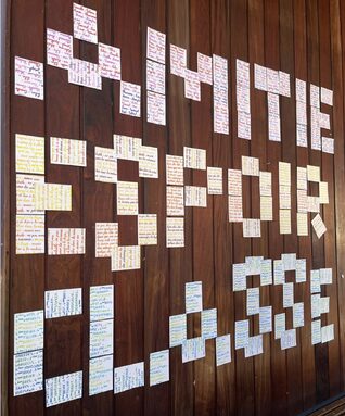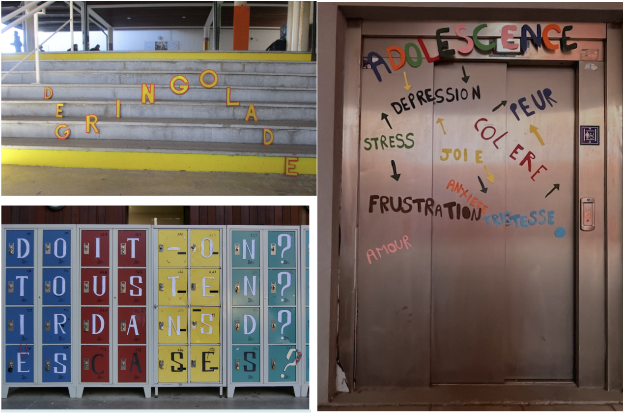 Les élèves des classes de GENTILESCHI, KURROSAWA et LYNCH ont eu à travailler en collaboratif sur la consigne suivante: "Choisissez dans le collège un lieu fort de sens pour vous et réalisez une installation éphémère qui mette en scène, principalement mais non exclusivement des mots. Cette installation devra prendre en considération tous les paramètres du lieu, (espace ouvert/fermé, éclairage, matériaux, horizontalité, verticalité, lieu de passage, lieu à l'écart, associé à une fonction, des personnes, une temporalité, des souvenirs...)