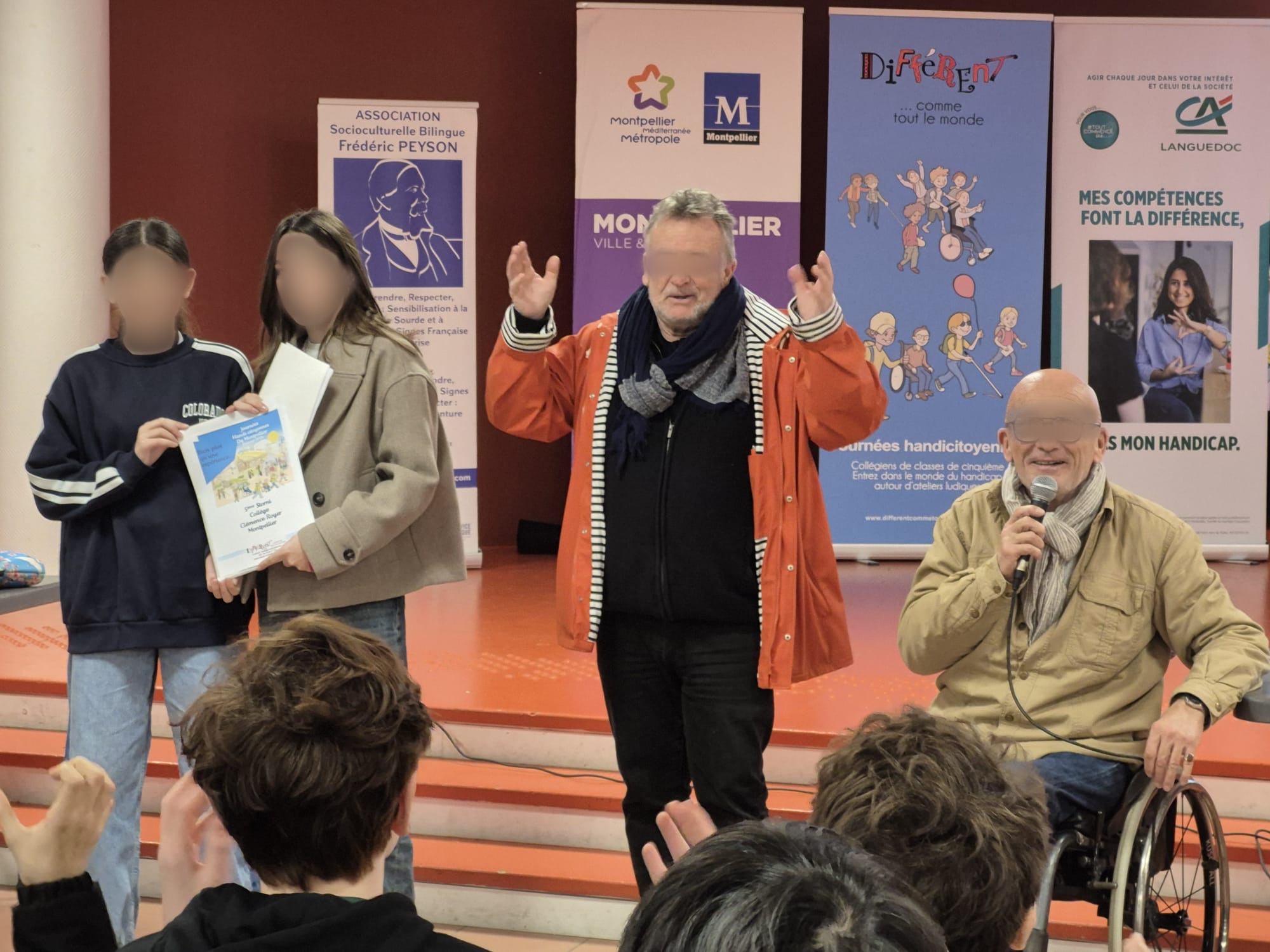 Ces ateliers se sont déroulés à l'Espace Pitot le mardi 27 janvier pour les journées Handicitoyennes, organisées depuis 13 années par l'association Différents Comme Tous Le Monde. Depuis 4 ans, cette sortie vient également faire écho au concours d'affiches citoyennes que Mme Detrez, CPE et M. Pont, professeur d'arts plastiques pérennisons depuis 12 ans au collège. Les élèves sont répartis par groupes et tournent sur des ateliers immersifs, (des mises en situations, des ateliers, des démonstrations), dyspraxie-trouble motricité, mobilité fauteuil, atelier braille, canne non-voyants, vélo tandem pour malvoyants et non voyants, langue des signes LSF... À l'issue de cette matinée, les élèves reçoivent symboliquement un diplôme de l'association qui fut créée en 2014 à l’initiative de Monsieur le préfet Jean-Christophe Parisot de Bayard, lui-même en situation de handicap. Un remerciement spécial à Paul Eric Laures qui, tous les ans par sa présentation, captive et inspire notre jeune public du collège C.Royer.