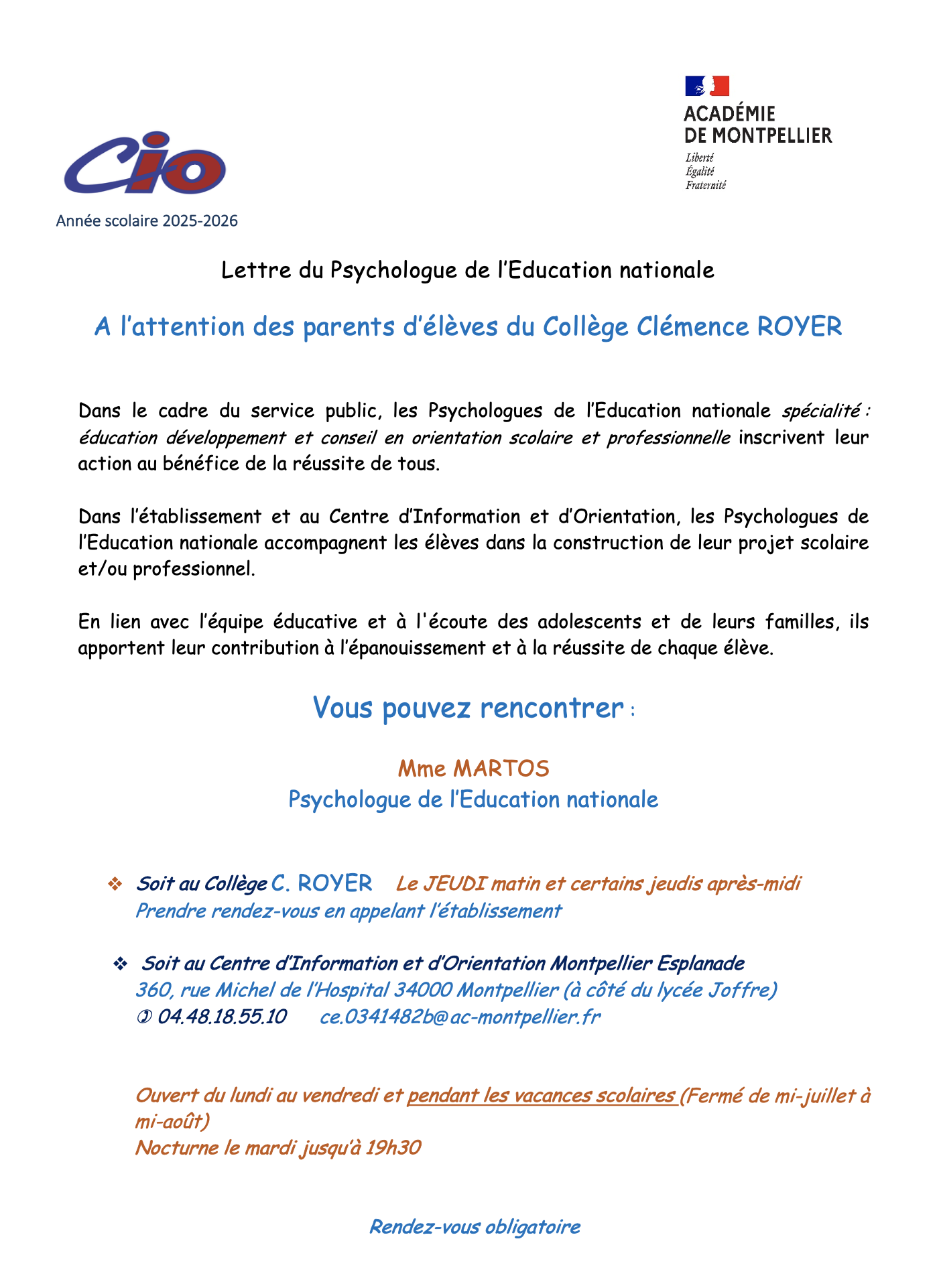 Mme Martos, psychologue de l'Education nationale, accompagne les élèves dans la construction de leur projet scolaire et/ou professionnel. Un document d'information permet de connaître les modalités pour la rencontrer au collège ou au CIO.
